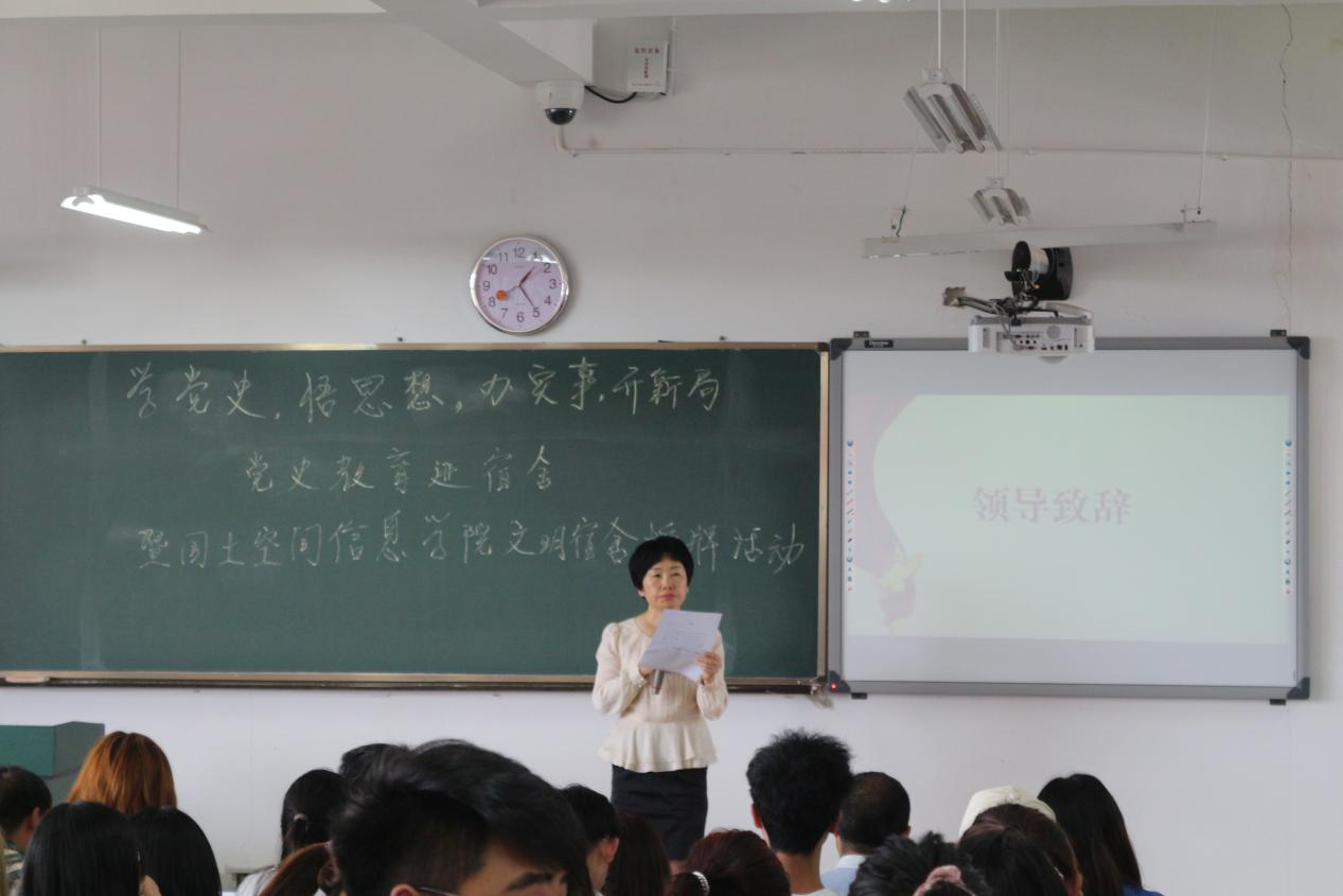 学生处处长李广涛向本次活动致辞,李老师向同学们讲述了学党史的重要性,他鼓励同学们积极学习党史,以党建带团建,创新宿舍管理制度,提高宿舍管理水平。