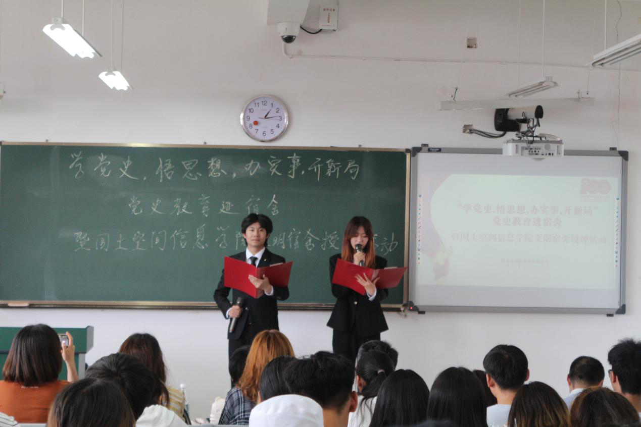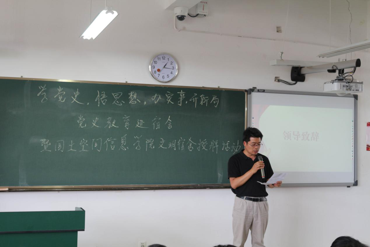 活动的最后一个议程是授牌仪式,由学生处处长李广涛老师、学院党总支书记高昆老师、宿舍管理中心主任刘杜妍老师、基础测绘支部书记武玉斌老师和国土管理支部书记瞿华崟老师为获得“6s示范宿舍”和6s达标宿舍”的同学颁奖。在“6s示范宿舍”学生代表上台分享宿舍内务整理经验后,与会领导及党员老师们走进宿舍,为示范宿舍和达标宿舍挂牌,并向宿舍的同学们讲党史故事。故事有:半截皮带的故事、刘启耀的故事、南昌起义第一枪、陈赓的老婆,以及半条棉被,鱼水情深等。