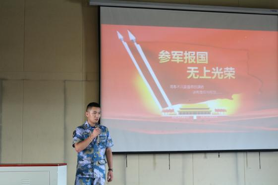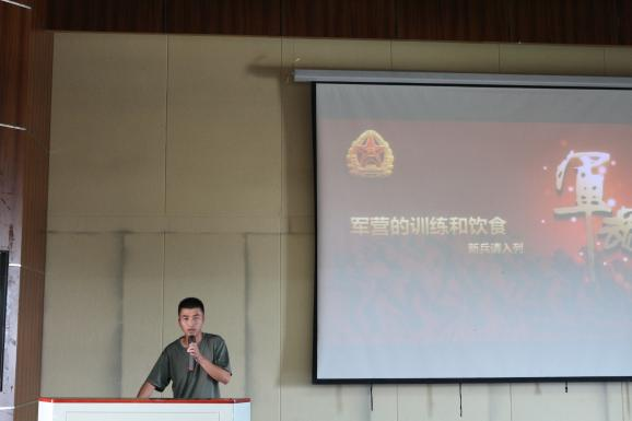 其次,退伍学生代表罗浩楠从征兵入伍条件及流程、相关政策、入伍优势三个方面做了详细的介绍,让同学们对参军入伍有了初步的认识;李俊宏同学通过一张张图片、一段段视频带领在场同学们了解军营生活,让大家身临其境地体会到了部队的风采;韩金银同学则从军营伙食方面为同学们做了介绍,他讲到,军营不仅是艰苦的,也是丰富多彩的,希望同学们能够把握住青春,踊跃报名参军。