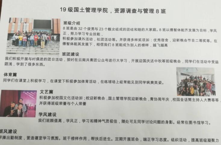 为进一步加强国土管理学院各班级“自我教育、自我管理、自我服务”的功能,充分发挥和调动学院各班级工作的积极性和创造性,加强学院各班级之间的联系与沟通,营造积极向上的班级学风,向全体师生展示班级风采,国土管理学院积极组织开展班级风采展示活动。