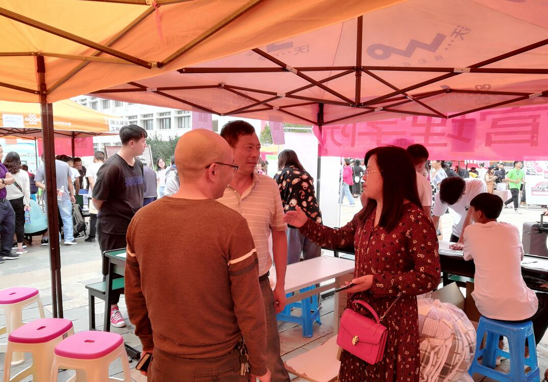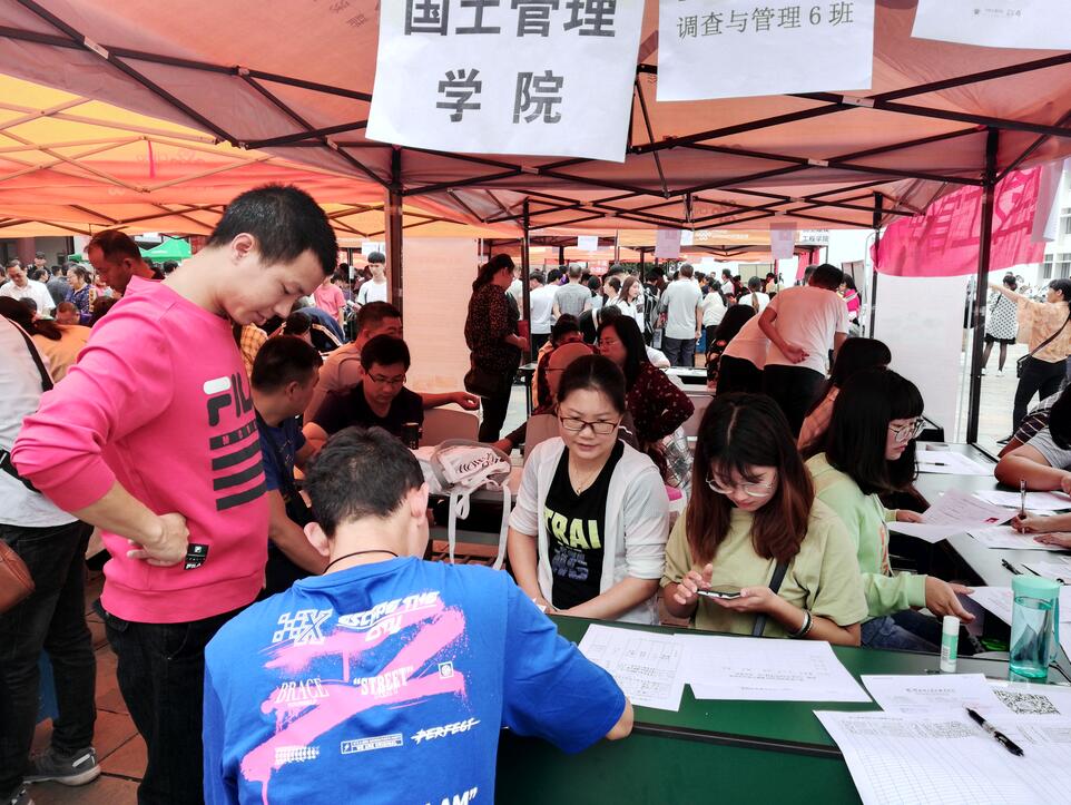 迎新现场,不同学院志愿者身着不同颜色服装,国土管理学院志愿者身着绿色服装,奔行于校车点、招办处、财务处、国土广场,学生宿舍等。志愿者以热情洋溢的微笑,解答新生各种疑问;以认真细致的态度,统计学生各种信息;以不辞辛劳的行动,带领学生去往住处。绿色服装志愿者及其他颜色服装志愿者,构成了学校一道靓丽的风景线。