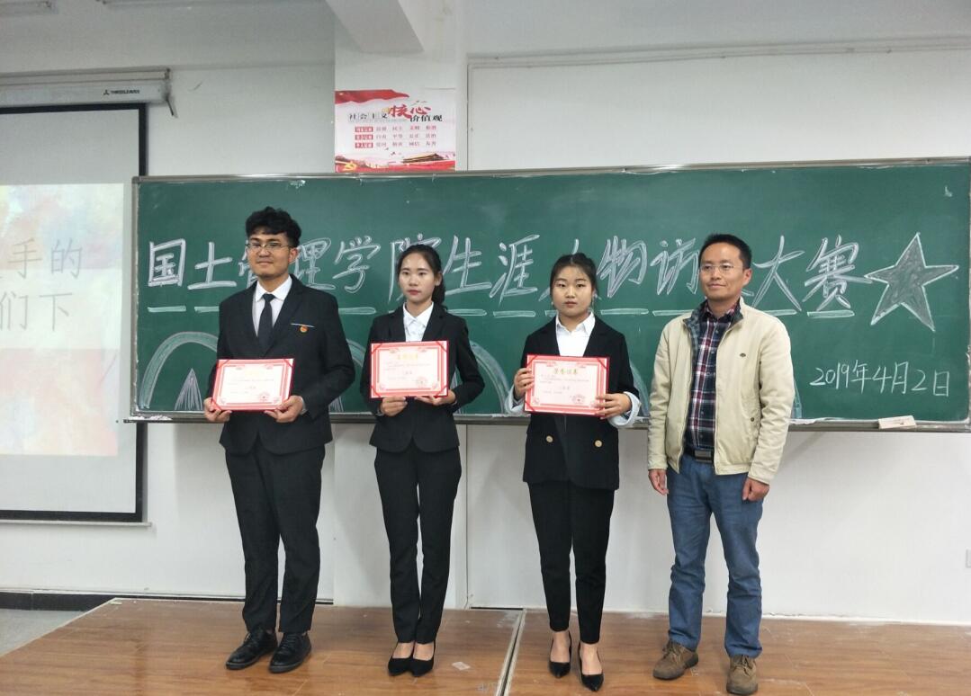 为使大学生了解自身职业发展方向,对自身职业发展做初步规划。国土管理学院于2019年4月2日晚19:00在堪物楼B316教室举行了生涯人物访谈大赛。国土管理学院职业规划导师组赵心亮老师、邓传青老师、瞿华蓥老师、张宏品老师及院团总支书记张桂枝老师出席了此次访谈赛,国土管理学院17、18级学生代表观摩了此次比赛。