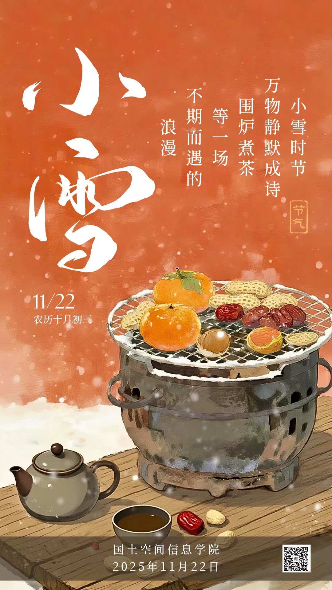 “晚来天欲雪,能饮一杯无?”小雪时节,邀上三五好友,围炉而坐,煮一壶热茶,谈天说地,任窗外风雪飘摇,屋内暖意融融。这是独属于冬日的闲适,也是对平淡生活的诗意雕琢。愿你在小雪的清寒中,找到属于自己的温暖角落,心怀热忱,奔赴下一程山海!