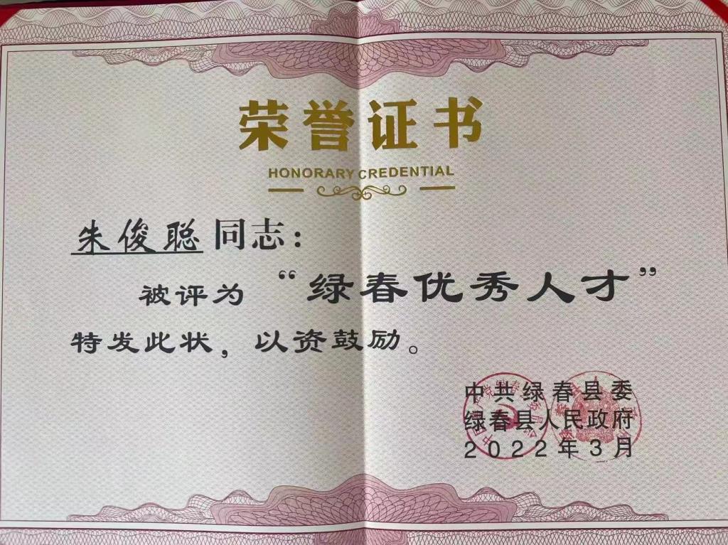 近日,红河州绿春县召开了人才工作会议,此次会议对34名“绿春县优秀人才”和145名强边固防、疫情防控一线工作人员进行了颁奖和通报表扬,其中新葡8883官网AMG官网教师朱俊聪被评为“绿春优秀人才”。