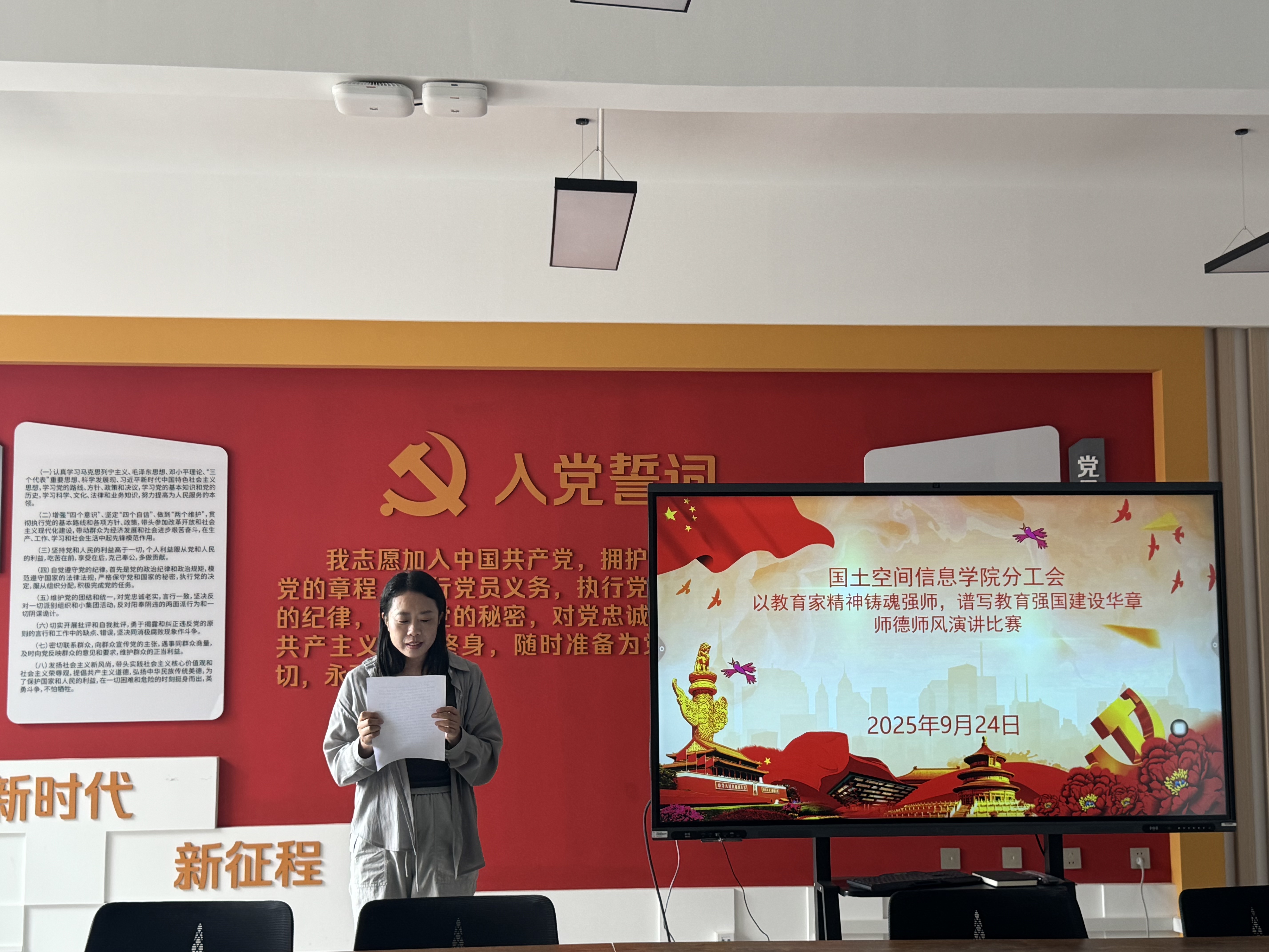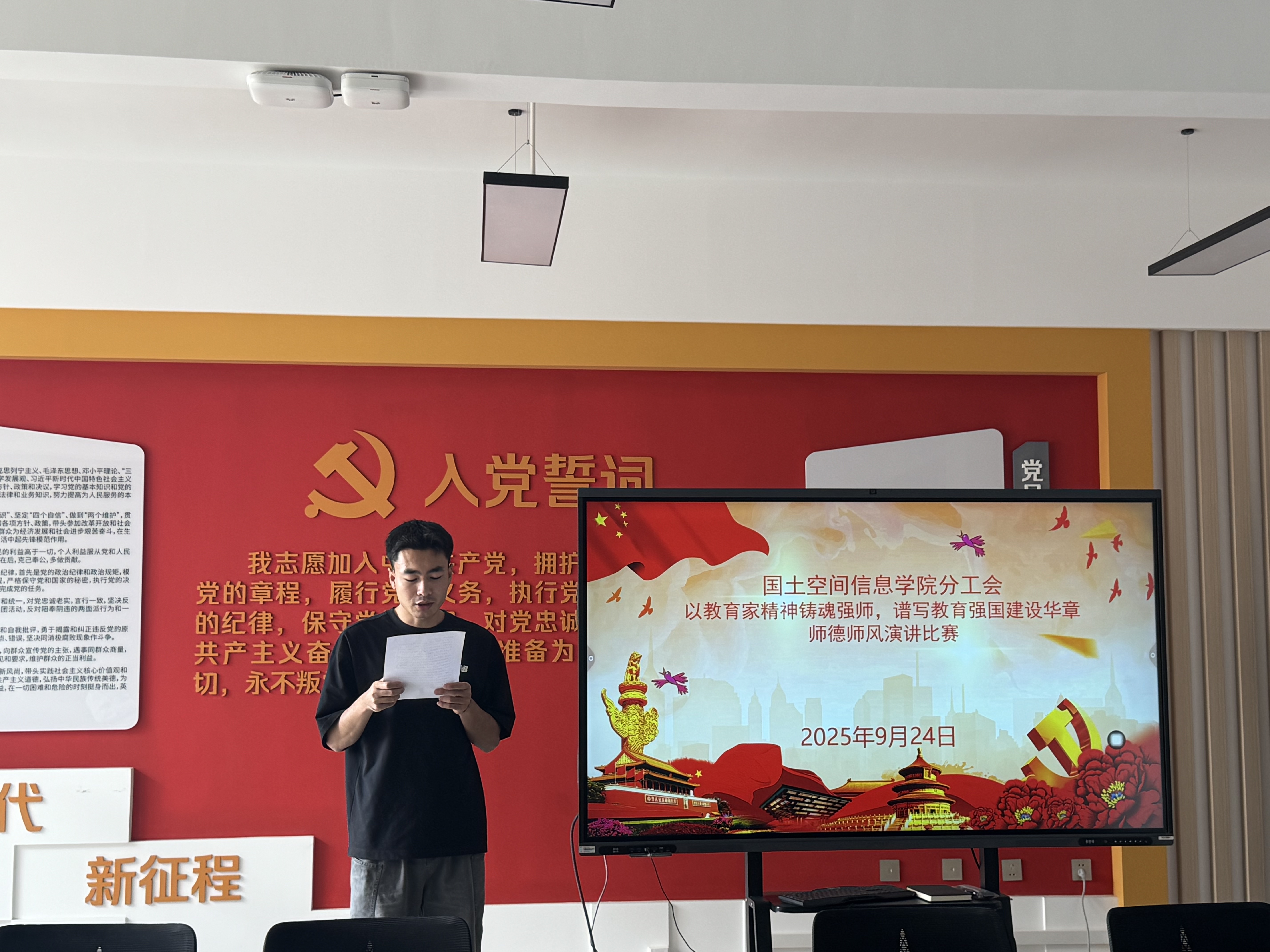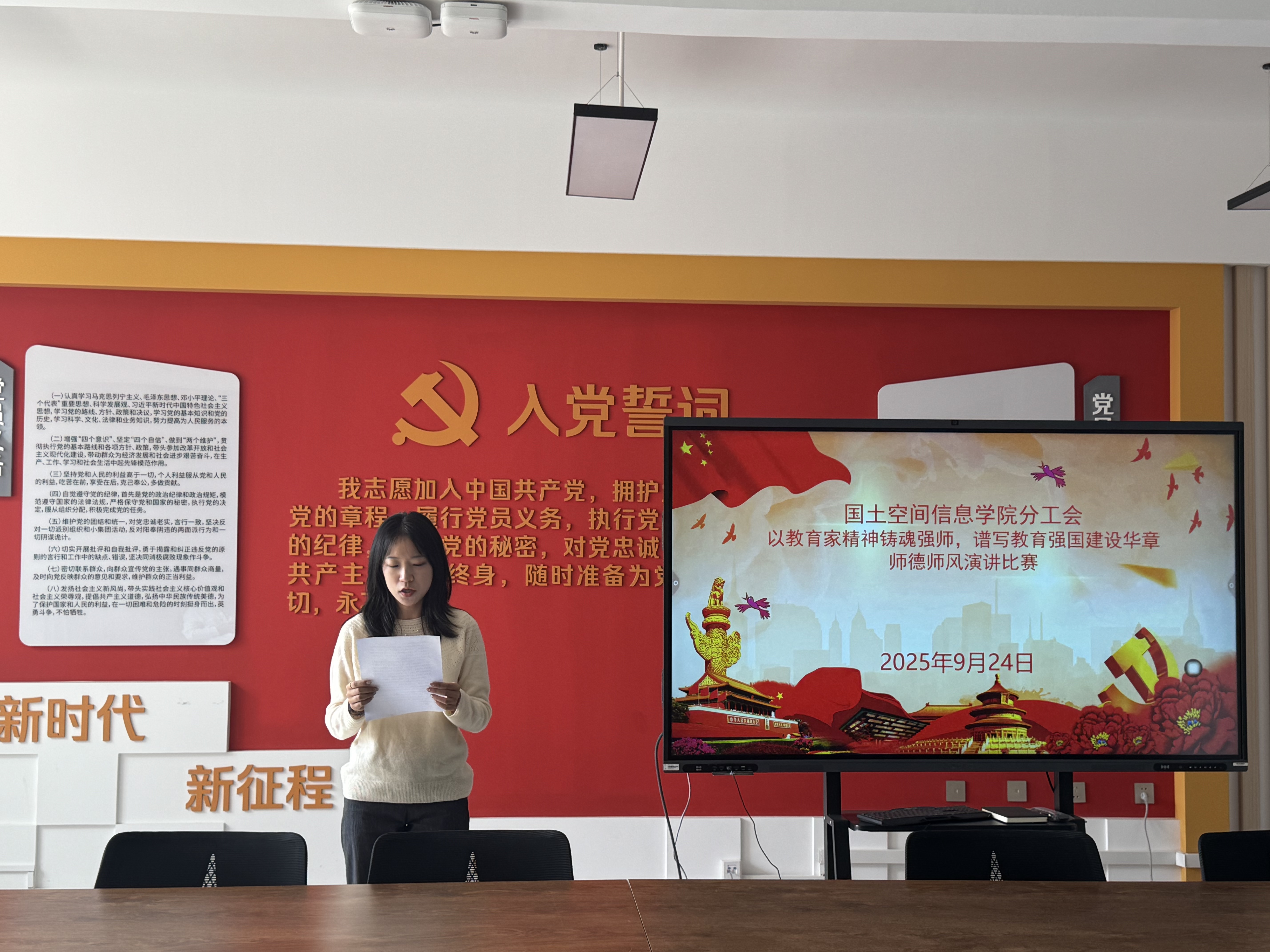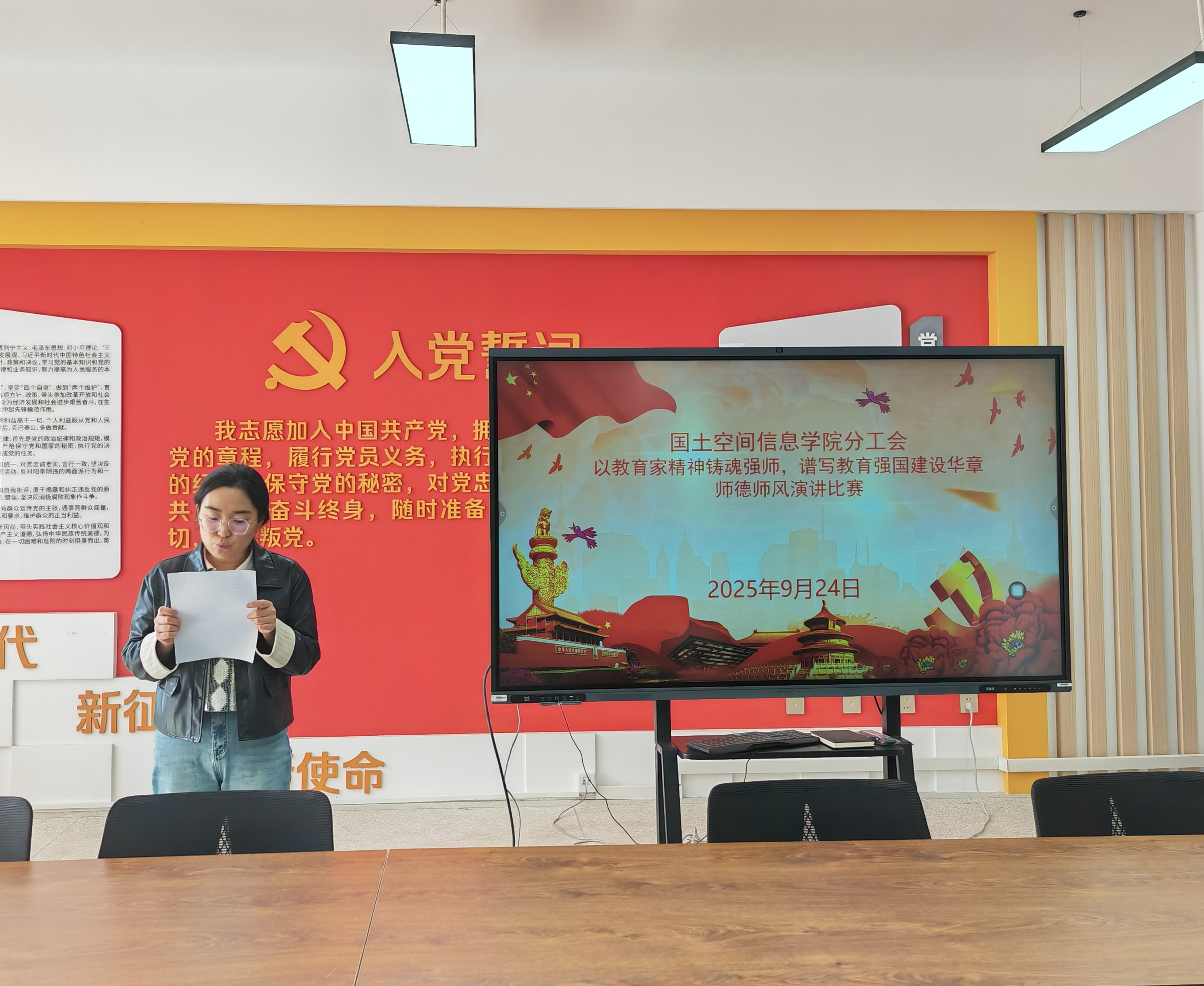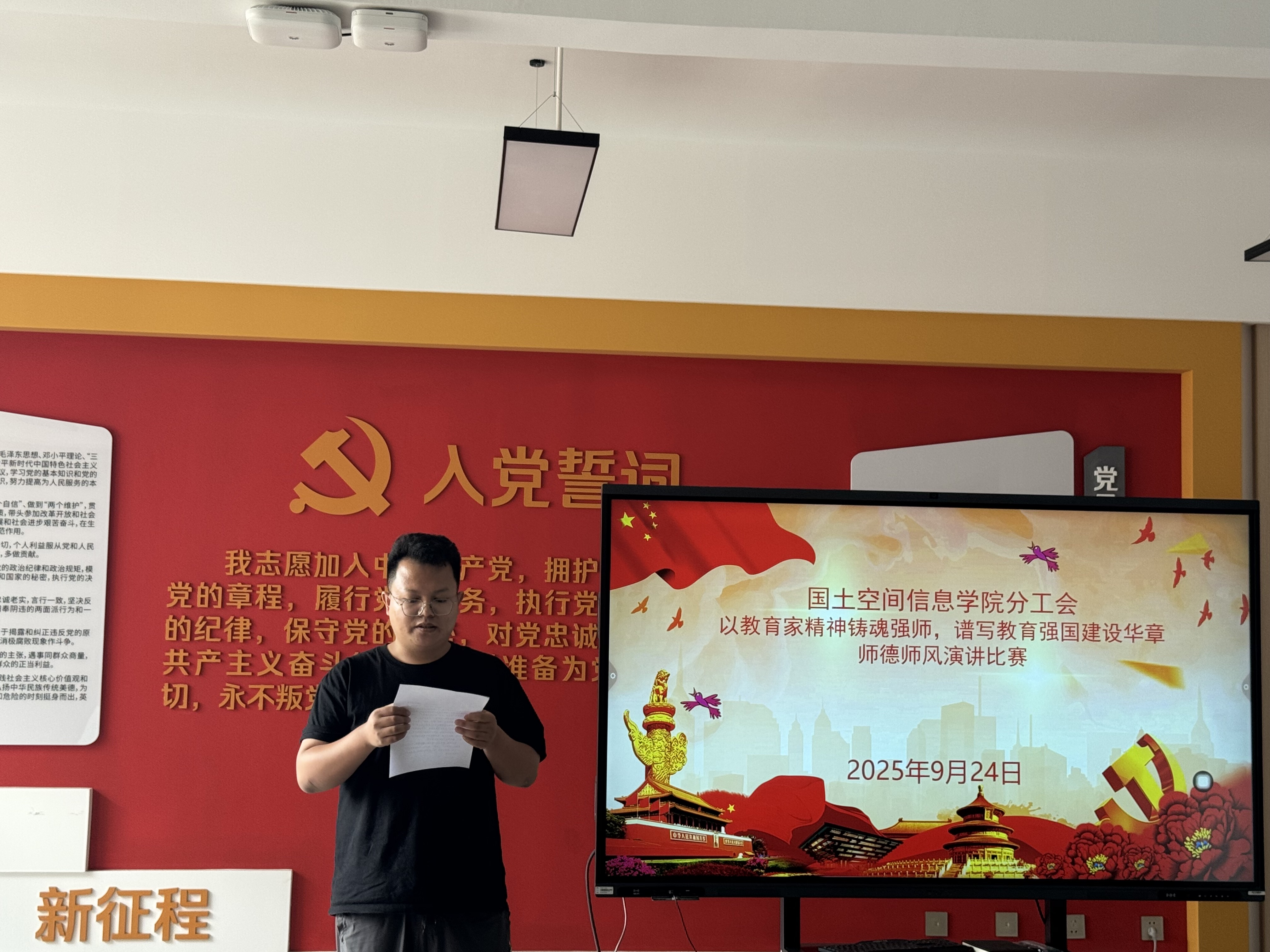 选拔赛现场,参赛教师紧扣“以教育家精神铸魂强师,谱写教育强国建设华章”主题,结合自身教学经历与身边榜样故事,生动诠释师德内涵。有的教师讲述学院前辈扎根地质教育一线、践行“三光荣”精神的感人事迹;有的教师分享带领学生开展野外实习、用“精准、坚守、奉献”的测绘精神培育专业人才的实践感悟;还有教师立足三尺讲台,畅谈如何以“立德树人”为根本,将师德师风融入日常教学的思考与行动。选手们的演讲情感真挚、事例鲜活,既有对教育初心的坚守,也有对新时代教师使命的担当,赢得现场阵阵掌声。