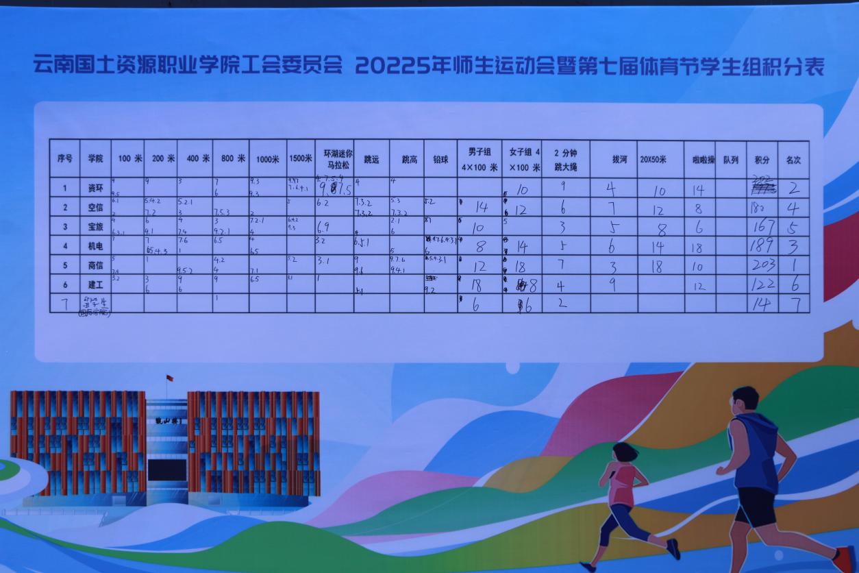 时序流转,盛会终章。11月22日,云南国土资源职业学院2025年师生运动会暨第七届体育文化节在全体师生的不舍与赞誉中圆满落幕。在这场体育盛会中,新葡官网师生团结一心、奋勇拼搏,最终斩获学生组团体第四名、教师组团体第六名的成绩,并荣获学生组道德风尚奖,充分展现了新葡官网师生良好的精神风貌和强大的团队凝聚力。