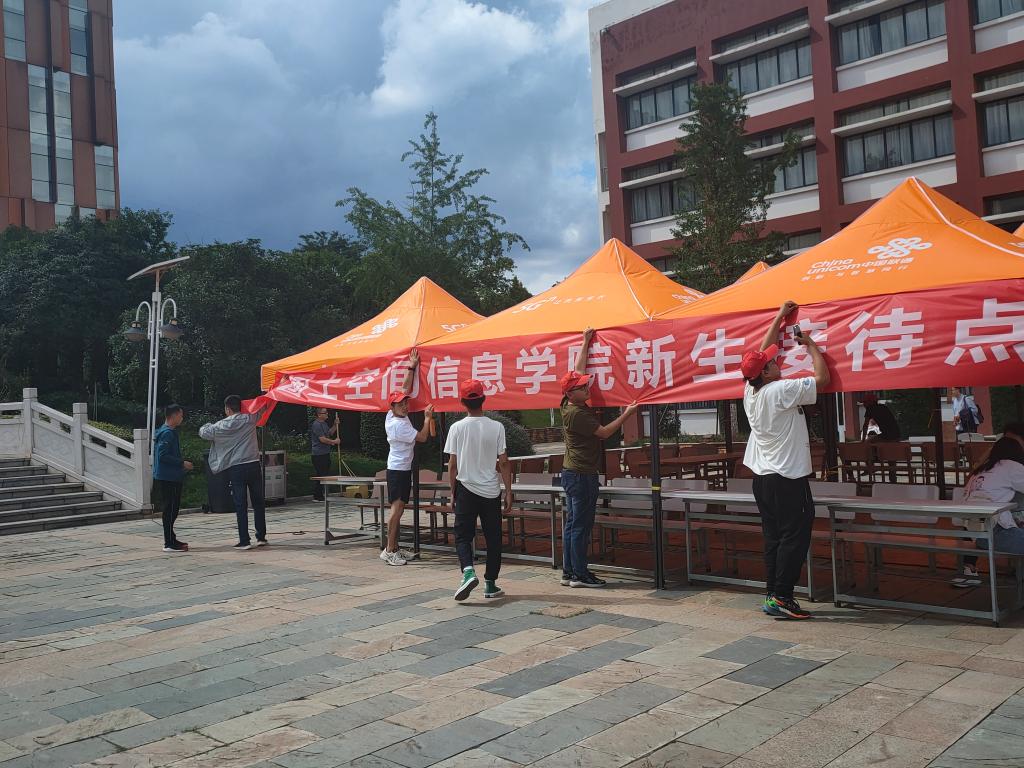 8月26日上午,辅导员、班主任、志愿者们早早来到新生接待点再次检查迎新物资是否配备齐全。