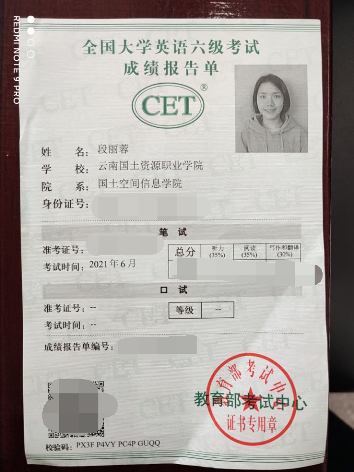 近日,2021年6月大学生英语四六级考试证书陆续发放,新葡官网学子喜获佳绩。19土管7班刘曜福、19土管3班周明菊、19城市1班刘正琴、20土管6班付蒋蝶、20土管9班彭思缘、20遥感2班黄健均通过英语四级考试,其中黄健同学取得558分的优异成绩。值得一提的是,新葡官网19土管3班的段丽蓉同学是新葡官网唯一一位参加英语六级考试的同学,她在此次考试中也取得了不错的成绩,希望她能再接再厉,不断突破自我。