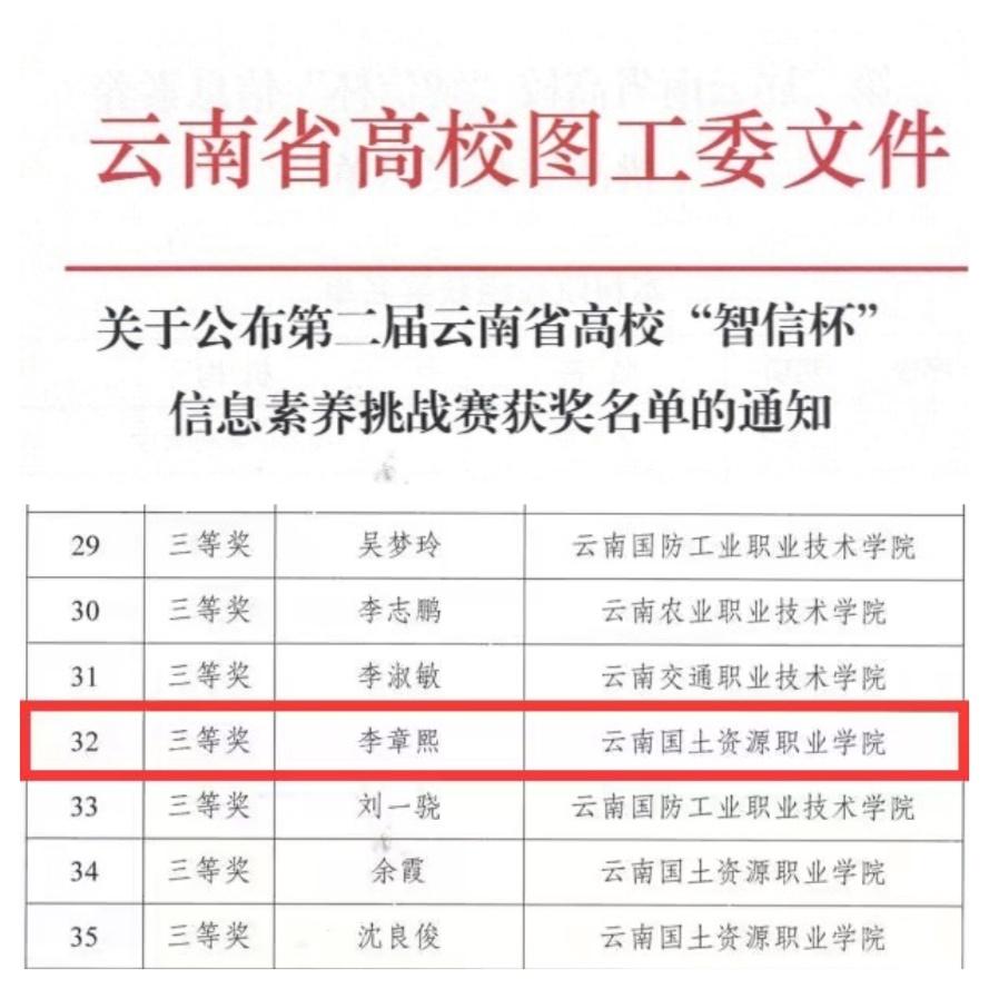 近日,由云南省高等学校图书情报工作指导委员会主办,各高校图书馆和北京智信数图公司承办的“第二届云南省高校‘智信杯’信息素养挑战赛”圆满结束,新葡官网22土管1班李章熙同学荣获三等奖。