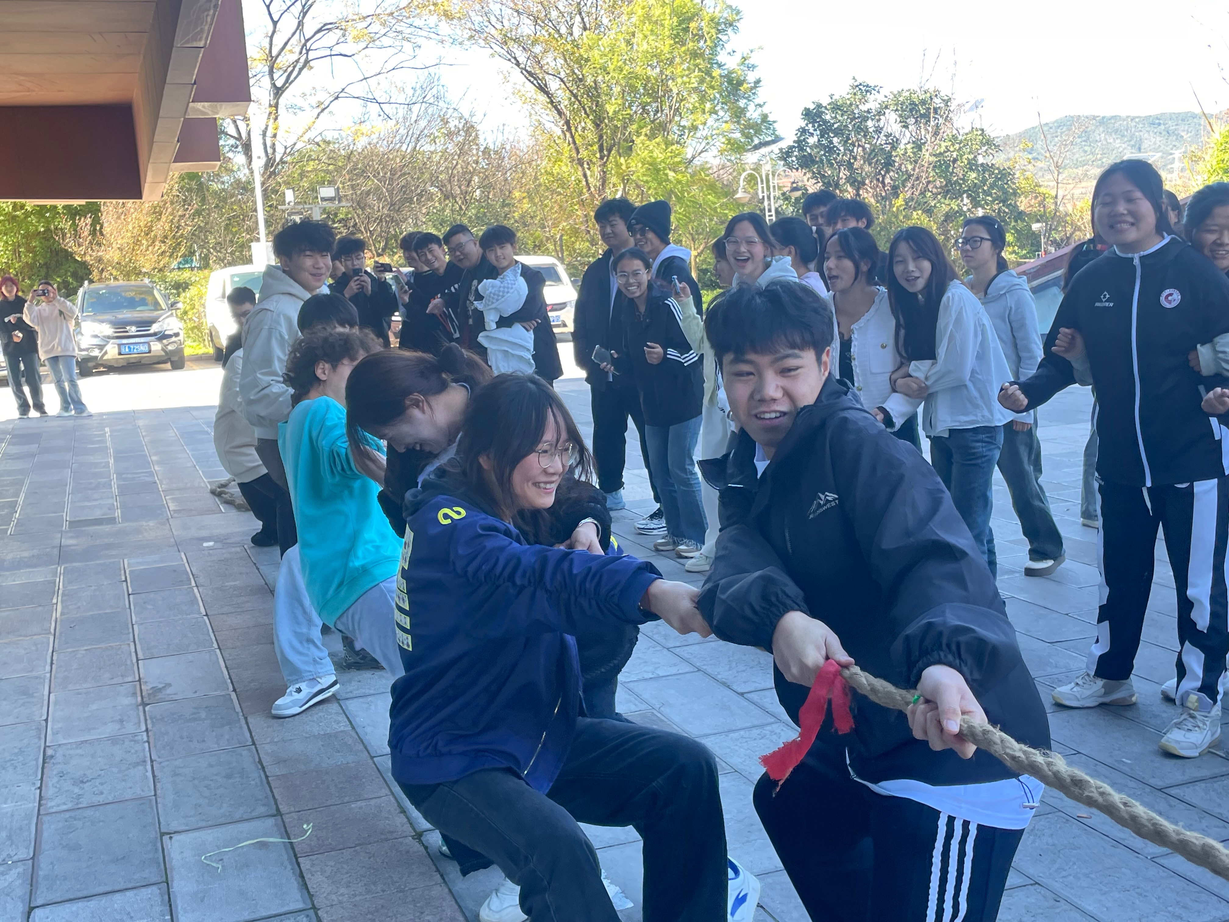 随后,两班同学迅速分组,投入了紧张而激烈的拔河比赛中。同学们紧握绳索,双脚牢牢地扎在地面,身体后倾,形成了一道坚固的人墙。他们的眼神坚定,呼吸同步,每一次的拉锯都是对团队力量的一次深刻体验。在观众的加油声中,两队你来我往,绳索在两队之间来回移动,每一次的推进都伴随着队员们的呐喊和汗水。