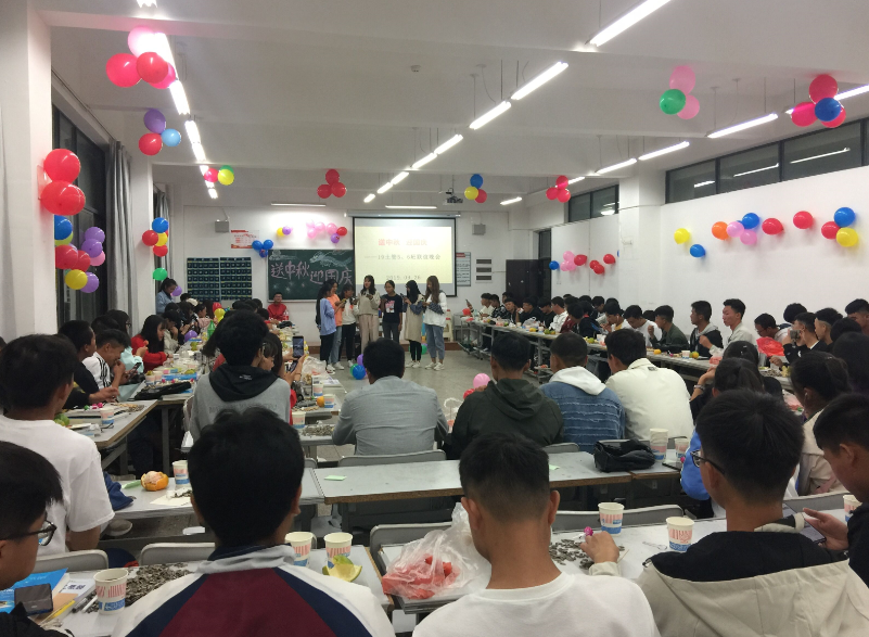 十一假期来临之前,国土管理学院2017-2019级各班在勘物楼教室举办“庆中秋迎国庆”或“送中秋迎国庆”晚会。晚会以学生班级自行组织为主。同学们精心布置的教室,桌子上摆放多种瓜果零食。晚会开始后,同学们个人或集体的形式登台的表演各式各样的节目。