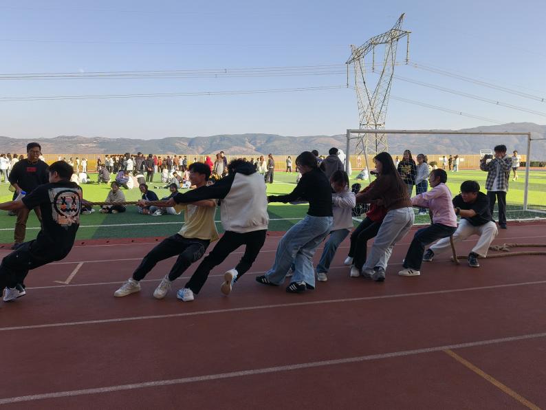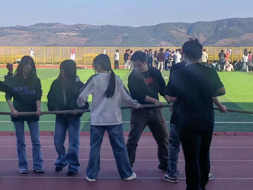 活动伊始,三个班同学们混合分组,准备开始今天的首个比赛项目——拔河。随着裁判一声哨响,双方同时发力,绳索瞬间绷直。赛场上,呐喊助威声震耳欲聋。在关键时刻,队伍里的“大力士”们稳住阵脚,带领大家齐心协力向后拉,充分体现了团结协作的力量。
