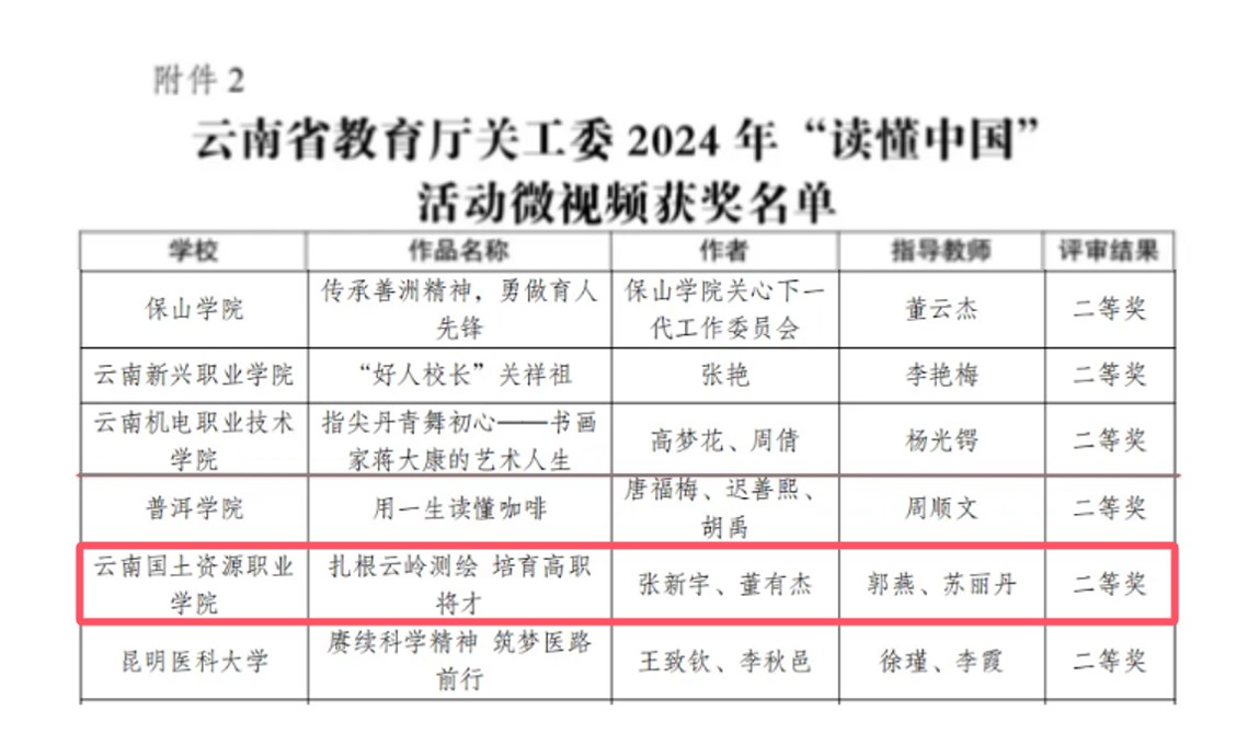 为深入学习贯彻党的二十大精神,省教育厅关工委在全省高校中全面开展以“教育强国,奋斗有我”为主题的“读懂中国”系列活动。自活动开展以来,学院高度重视活动的开展并给予大力支持,紧紧围绕“教育强国,奋斗有我”主题,组织青年学子与“五老”代表深入交流。根据《云南省教育厅关心下一代工作委员会关于公布2024年“读懂中国”活动评审结果的通知》公布的获奖名单,由新葡官网郭燕和苏丽丹两位老师共同指导的2023级智慧城市管理技术1班张新宇、2022级导航与位置服务2班董有杰两位学生制作的微视频《扎根云岭测绘 培育高职匠才》作品荣获二等奖。