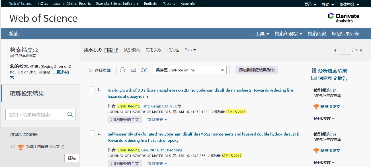 基本科学指标数据库(Essential Science Indicators,简称ESI)最新数据显示,安全工程系周克清老师发表的论文“In situ growth of 0D silica nanospheres on 2D molybdenum disulfide nanosheets: Towards reducing fire hazards of epoxy resin”入选高被引论文。该论文是周克清老师以永利集团官网(武汉)永利集团官网为第一单位、第一作者和通讯作者身份发表的第2篇ESI高被引论文。2018年7月周克清老师发表的论文“Self-assembly of exfoliated molybdenum disulfide (MoS2) nanosheets and layered double hydroxide (LDH): Towards reducing fire hazards of epoxy”曾同时入选ESI高被引论文和热点论文。