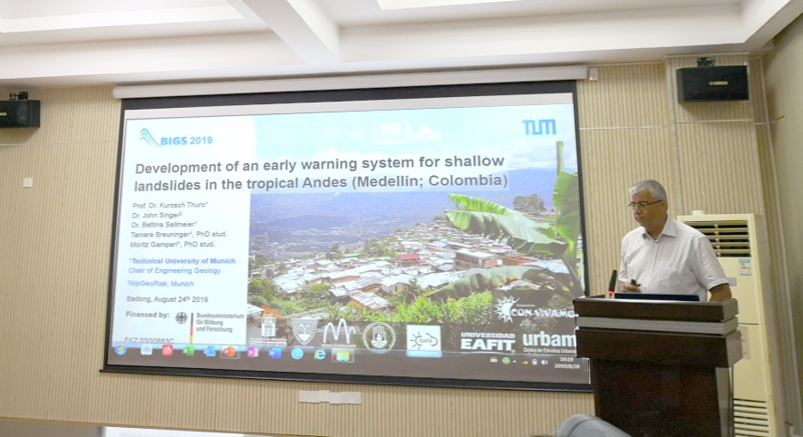 Kurosch Thuro教授以《Development of an early warning system for shallow landslides in the tropical Andes (Medellín; Colombia)》为题,介绍了哥伦比亚研究区的地质灾害特点、地质灾害调查方法、监测手段和预警判据等,从分析灾害运动特征、灾害触发机制和数据管理等角度构建3D早期预警系统,并与师生进行了深入交流。
