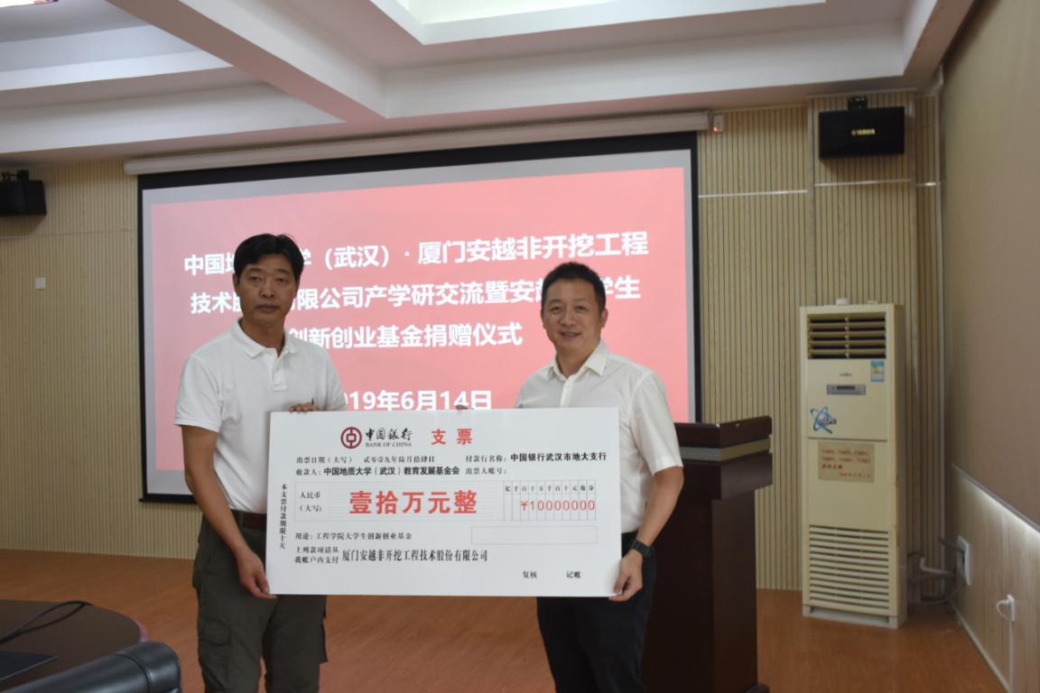 2019年6月14日上午,厦门安越非开挖技术股份有限公司来校作产学研交流,并捐赠10万设立安越大学生创新创业基金,捐赠仪式在315举行。厦门安越非开挖技术股份有限公司董事长廖宝勇一行、武汉中地大非开挖研究院有限公司总经理孔耀祖,校友工作与教育基金管理处副处长吕占峰、丁苗苗,永利集团官网党委书记陈飞、党委副书记江广长、副教授曾聪参加会议。江广长主持会议。