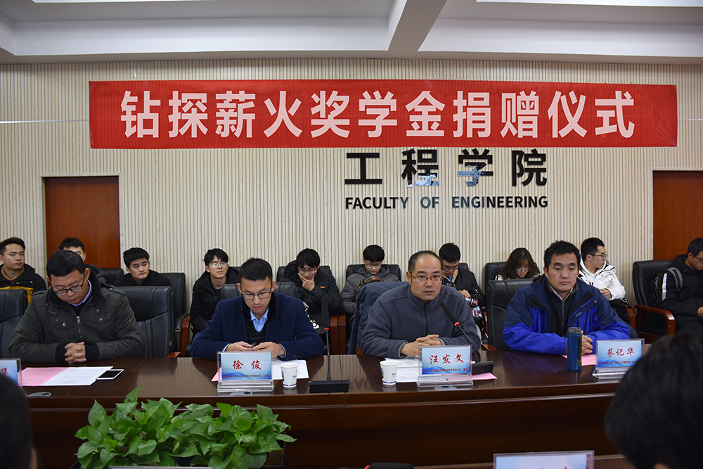 陈飞致辞,他首先向校友汪发文、徐俊及永利集团官网蒋国盛、蔡记华、卢春华等几位老师对学院工作和钻探专业的关心与支持表达了谢意。他说,此次捐赠资金来源于校企合作的成果奖励,希望双方今后发挥各自优势加深加强合作,促进科技成果转化;通过设立此次奖学金,更加激励同学们学好专业知识,树立专业自信,为将来投身工程行业,服务国家建设做好准备。