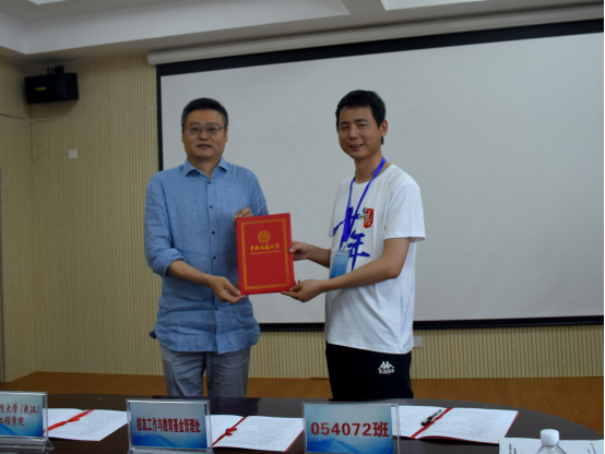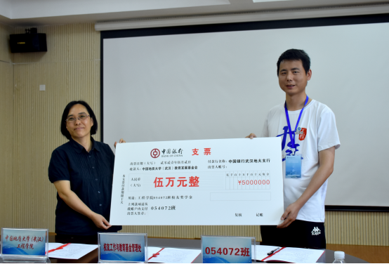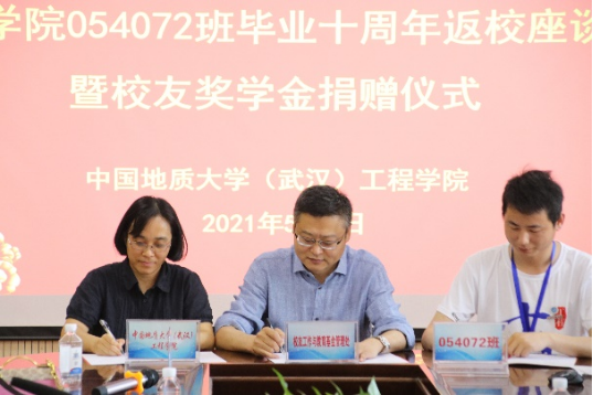 随后举行054072班校友奖学金捐赠仪式。校友大使袁攀同学简要介绍了发起奖学金的初衷、目的和用途。他说到,毕业十周年之际,为了表达对母校的感恩和思念,班级同学想为学院做些有意义的事情,经过商讨,决定捐赠奖学金用来对立志投身工程勘察行业的学弟学妹们的激励与帮助。