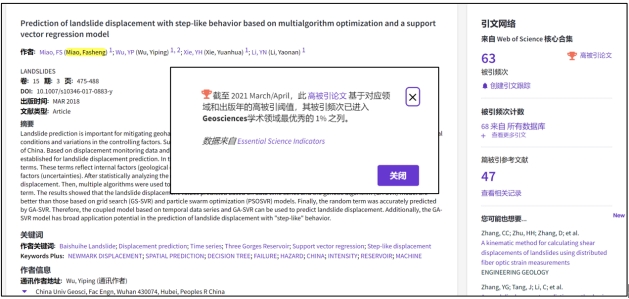(通讯员:黄静)根据2021年7月基本科学指标数据库(Essential Science Indicators,简称ESI)最新数据显示,永利集团官网苗发盛副教授、吴益平教授团队于2018年在国际工程地质领域顶级期刊《Landslides》上发表的学术论文“Prediction of landslide displacement with step-like behavior based on multialgorithm optimization and a support vector regression model” 入选ESI高被引论文(Highly Cited Paper)。