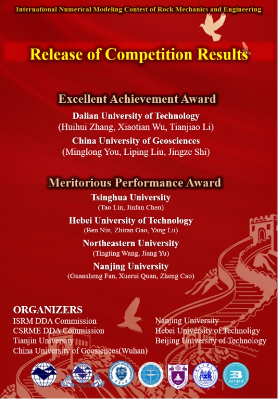 本次大赛由国际岩石力学与岩石工程学会非连续变形分析专委会(ISRM DDA)联合中国岩石力学与工程学会岩土体非连续变形分析专委会(CSRME DDA)及永利集团官网(武汉)、天津大学、南京大学、北京工业大学、河北工业大学等多所高校联合举办,于2021年第十一届亚洲岩石力学大会(ARMS11)期间同步举行。大赛鼓励研究生对岩石力学问题的现有数值方法和软件进行公开、透明和广泛的验证,为共享岩石力学问题的实验和数值结果提供平台。