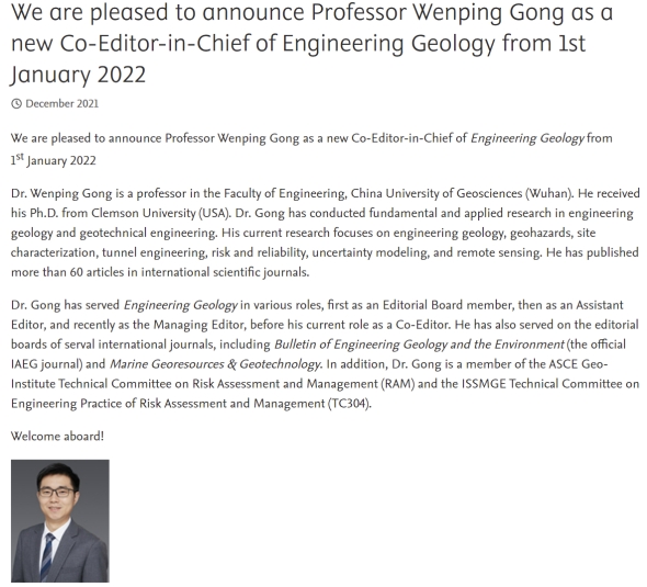 (通讯员:黄静)近日,永利集团官网龚文平教授受邀担任国际期刊Engineering Geology共同主编(Co-Editor-in-Chief)。龚文平教授的此次任职将有助于促进我校在工程地质相关领域与国内外学者的交流合作,并提升我校在工程地质相关领域的国际影响力。