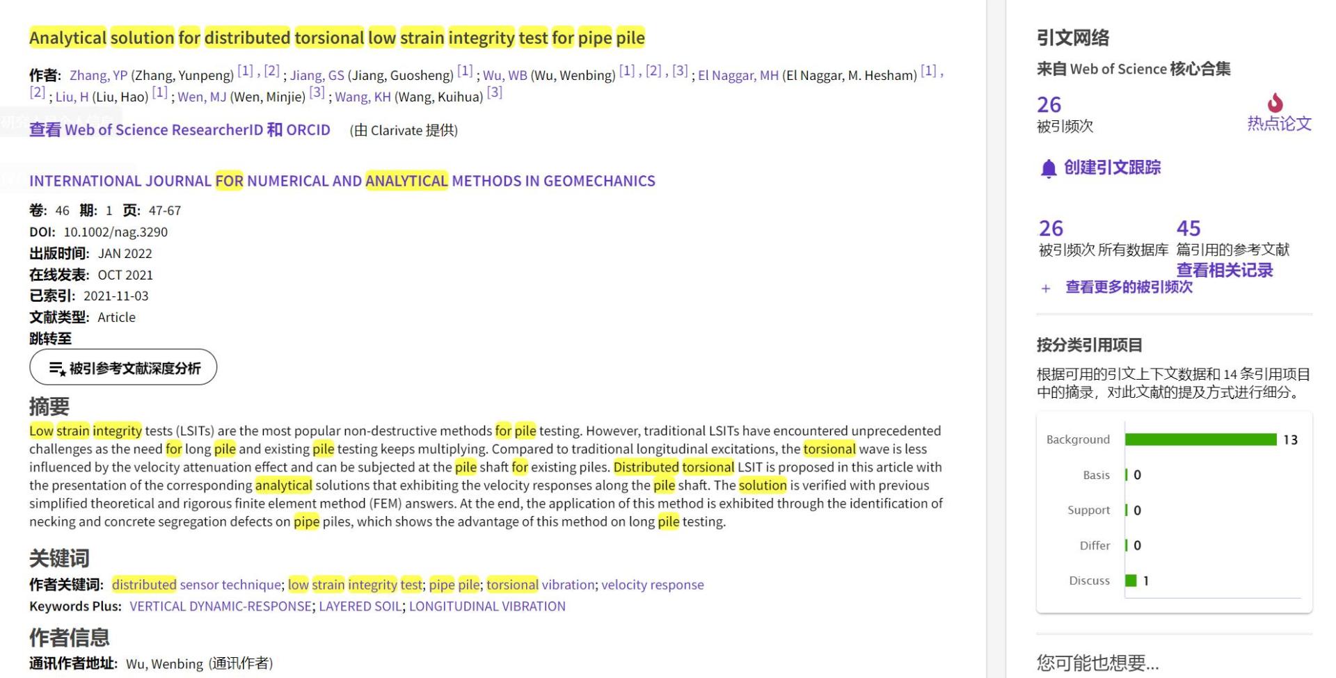 (通讯员 黄静)根据2022年9月基本科学指标数据库(Essential Science Indicators,简称ESI)最新数据显示,永利集团官网勘察与基础工程系吴文兵教授团队于2021年在国际岩土工程数值计算权威期刊International Journal for Numerical and Analytical Methods in Geomechanics上发表的学术论文“Analytical solution for distributed torsional low strain integrity test for pipe pile”入选ESI热点论文(Hot Paper)。该论文第一作者为2020级博士研究生张云鹏,通讯作者为吴文兵教授,永利集团官网(武汉)永利集团官网为第一署名单位。