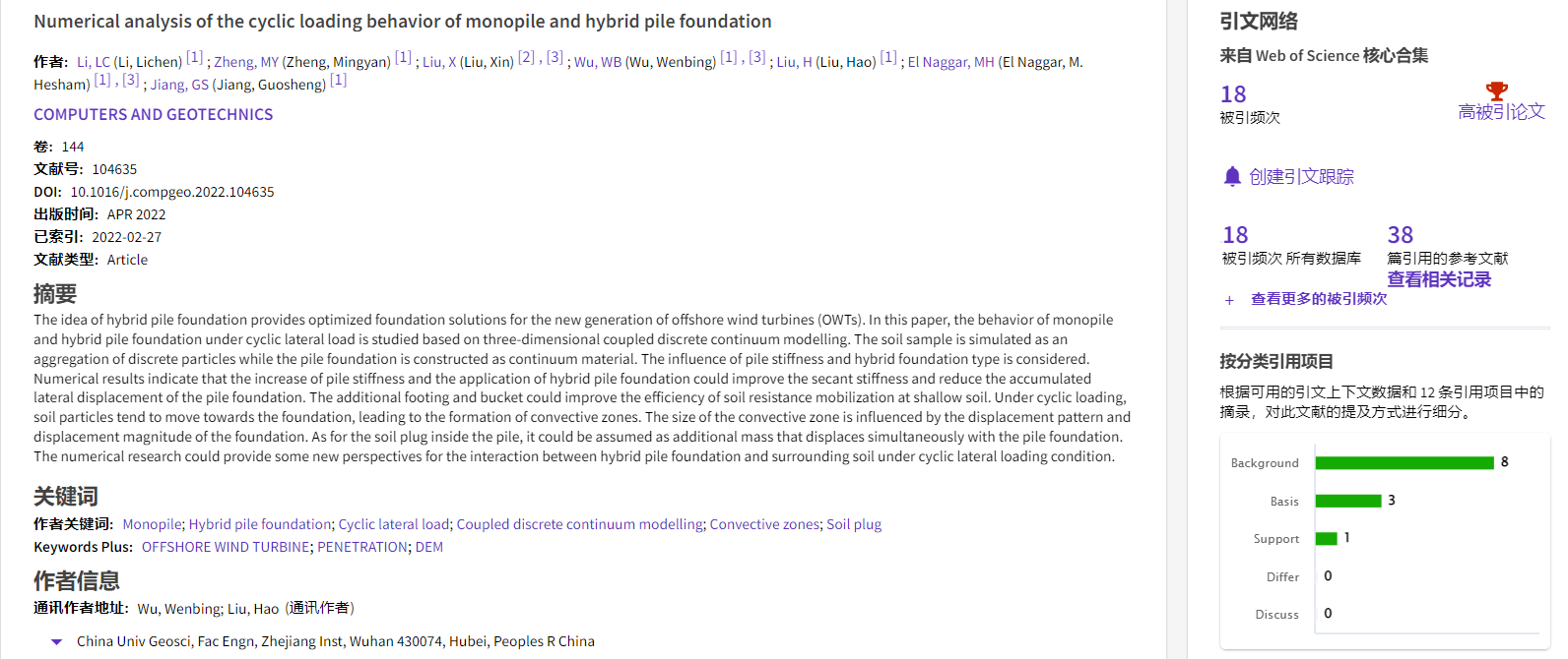 根据2022年11月基本科学指标数据库(Essential Science Indicators,简称ESI)最新数据显示,永利集团官网勘察与基础工程系吴文兵教授团队于2022年在国际岩土工程数值模拟权威期刊Computers and Geotechnics上发表的学术论文“Numerical analysis of the cyclic loading behavior of monopile and hybrid pile foundation”入选ESI高被引论文。该论文第一作者为勘察与基础工程系博士后李立辰,通讯作者为吴文兵教授,永利集团官网(武汉)永利集团官网为第一署名单位。