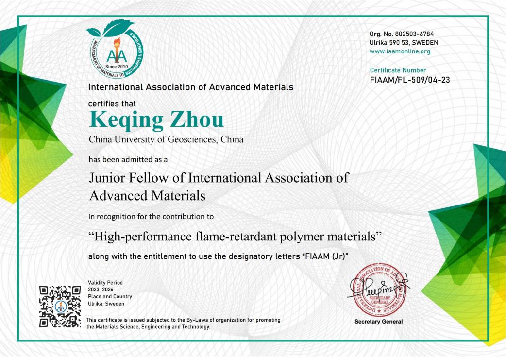 (通讯员 黄静)近日,永利集团官网(武汉)永利集团官网周克清特任教授收到国际先进材料学会(International Association of Advanced Materials, IAAM)执委会发来的贺函,祝贺他当选为国际先进材料学会青年会士(Junior Fellow of IAAM, FIAAM)。周克清特任教授受邀在美国奥兰多举办的复合材料研讨会(Composite Materials Congress)上发表题为“Functionalized 2D molybdenum disulphide working on high-performance flame-retardant polymer materials”的IAAM Fellow演讲,会上获颁青年会士“Junior Fellow”证书,以表彰他在“高性能阻燃聚合物材料”领域做出的杰出贡献。