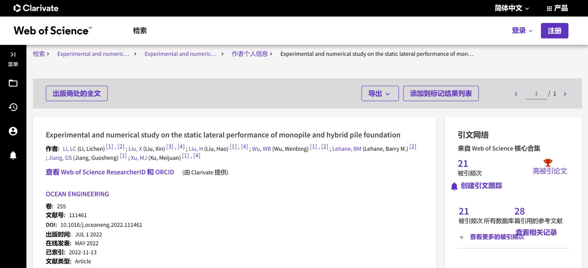 (通讯员 吴文兵)根据2023年6月基本科学指标数据库(Essential Science Indicators,简称ESI)最新数据显示,永利集团官网勘察与基础工程系蒋国盛教授团队于2022年在国际海洋岩土领域权威期刊Ocean Engineering上发表的学术论文“Experimental and numerical study on the static lateral performance of monopile and hybrid pile foundation”入选ESI高被引论文。该论文第一作者为勘察与基础工程系博士后李立辰,通讯作者为吴文兵教授,永利集团官网(武汉)永利集团官网为第一署名单位。