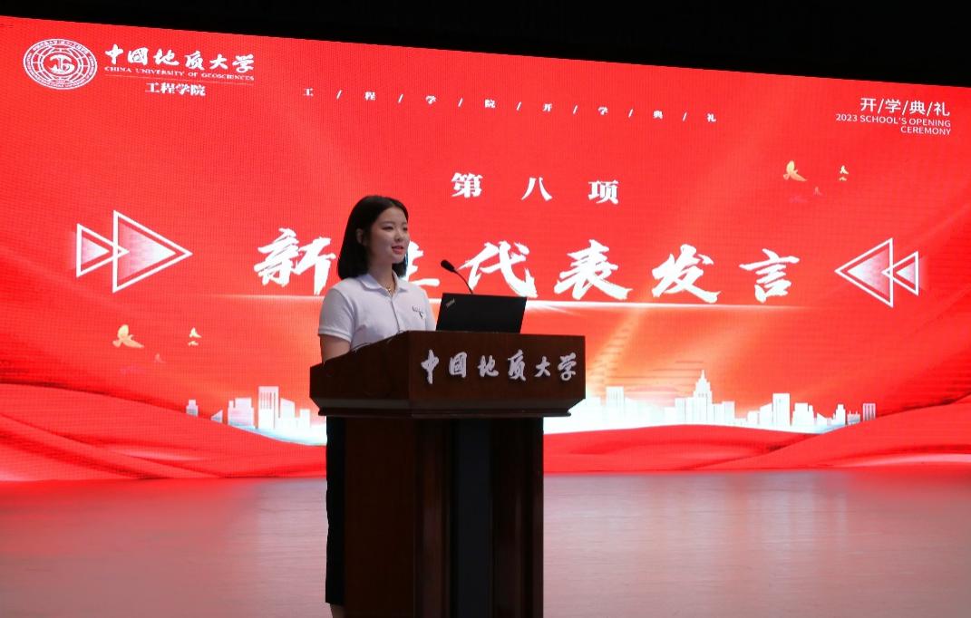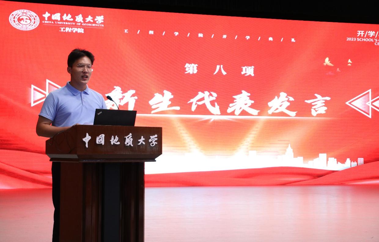 2023级05D231班张高涵同学作为本科生新生代表发言。他说,在长辈厚重岩土气息的熏陶下,自己终于如愿考进地质大学,加入永利集团官网。他对开学报到以来学院领导老师给予的教育关怀表示感谢,对军事训练当中空军预警学院教官对自己坚忍毅力和良好作息的打造由衷感激,他立志与其他505名本科新生同学一道,以强国建设、民族复兴的时代号召为号角,以“品德高尚、基础厚实、专业精深、知行合一”的成才目标为向导,直挂云帆,乘风破浪,早日成为德智体美劳全面发展的中国特色社会主义事业的建设者和接班人。