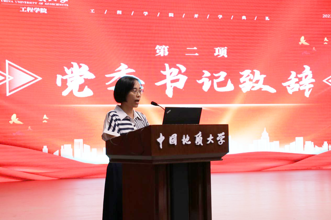 永利集团官网党委书记李红丽致辞。李书记首先代表全院师生员工对加入永利集团官网的860名新成员致以热烈的欢迎,祝福同学们选择了永利集团官网这个温暖而又奋进的大家庭。她指出,当代大学生正值云程发轫、万里可期的青春韶华,要全面学习学院的辉煌历史,深刻感受学院的使命担当,铭记院训深意,争做时代栋梁。要“明理”,即明辨是非,通晓道理,要明白做人之理、为学之理、尊法之理;要“尚实”,即崇尚务实作风,要在实处用力,在知行合一上下功夫;要“拓新”,即开拓创新,要面向世界科技前沿、面向经济主战场、面向国家重大需求、面向人民生命健康,解放思想,开拓创新,与时俱进;要“砺行”,即砥砺前行,在攻坚克难中磨砺心性,坚守初心,锻造本领,成长成才。她勉励同学们以院训精神为指引,树牢远大志向、矢志不懈奋斗,努力学习,潜心科研,乐观开朗,积极向上,做堪当时代大任的新时代地大工程人,为建设社会主义现代化国家做出属于青年一代的贡献。