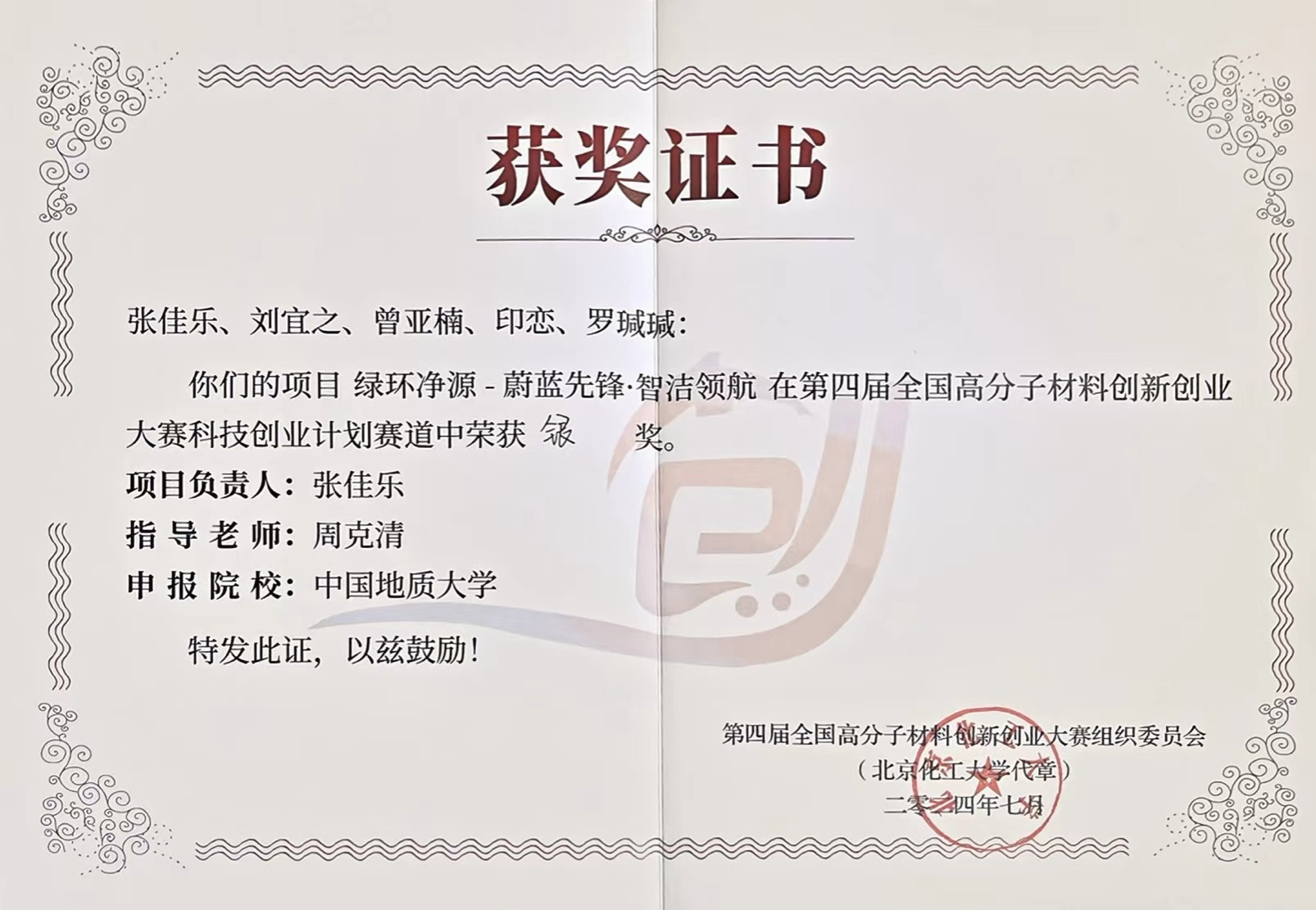 周克清特任教授指导的《绿环净源-蔚蓝先锋·智洁领航》项目荣获第四届全国高分子材料创新创业大赛科技创业计划赛道银奖。项目团队成员包括永利集团官网安全工程系本科生张佳乐、刘宜之、博士研究生生印恋、罗瑊瑊和马克思主义学院本科生曾亚楠。