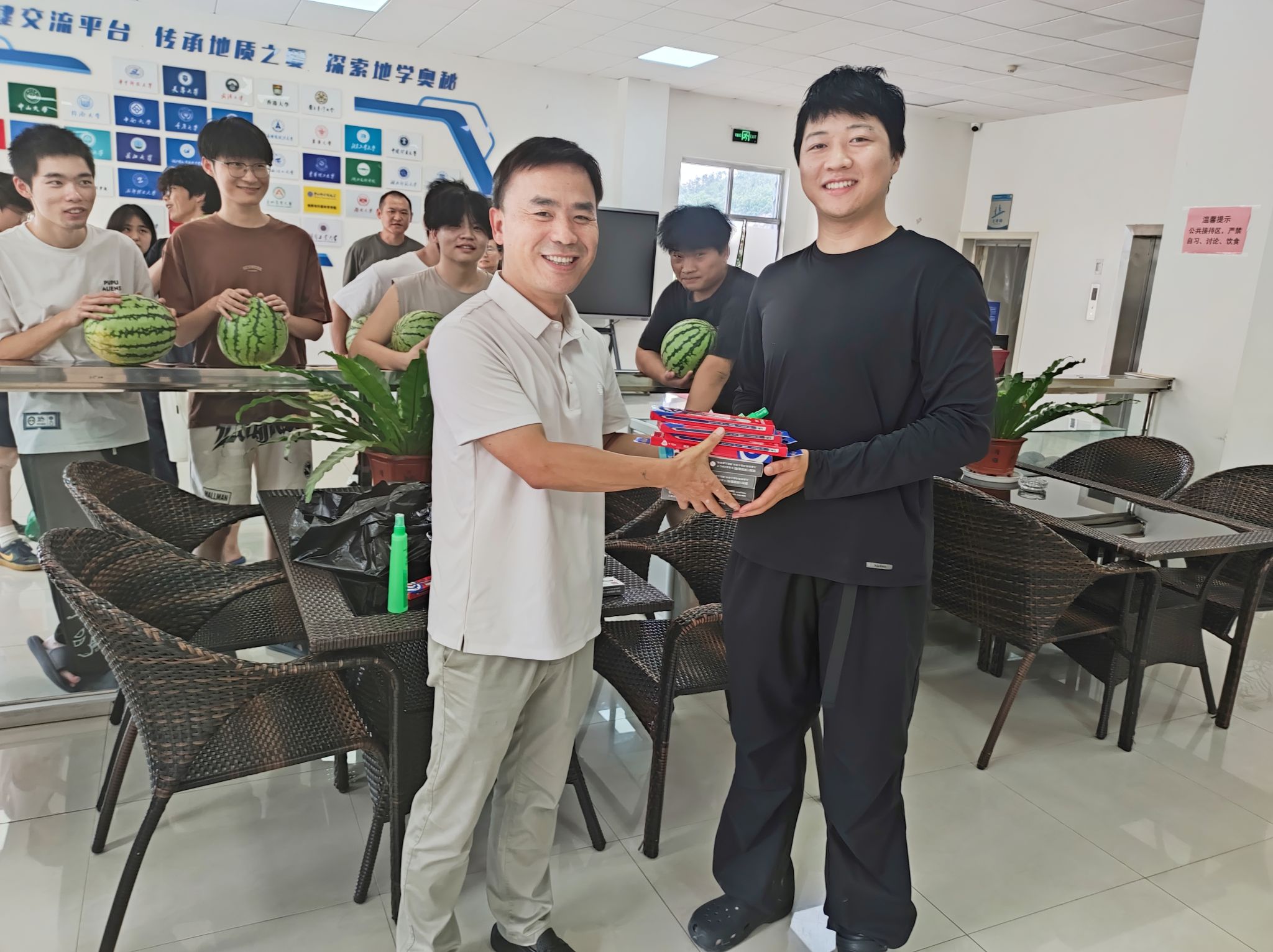 在秭归实习站期间,李红丽等老师为全体实习师生及基地管理人员发放防暑物资、学习文具等慰问品,在炎炎夏日里为野外实习师生送来丝丝清凉与温暖关怀,她细致询问大家的实习体验与生活情况,再三叮嘱大家务必注意防暑降温、合理作息,确保实习工作安全有序推进。