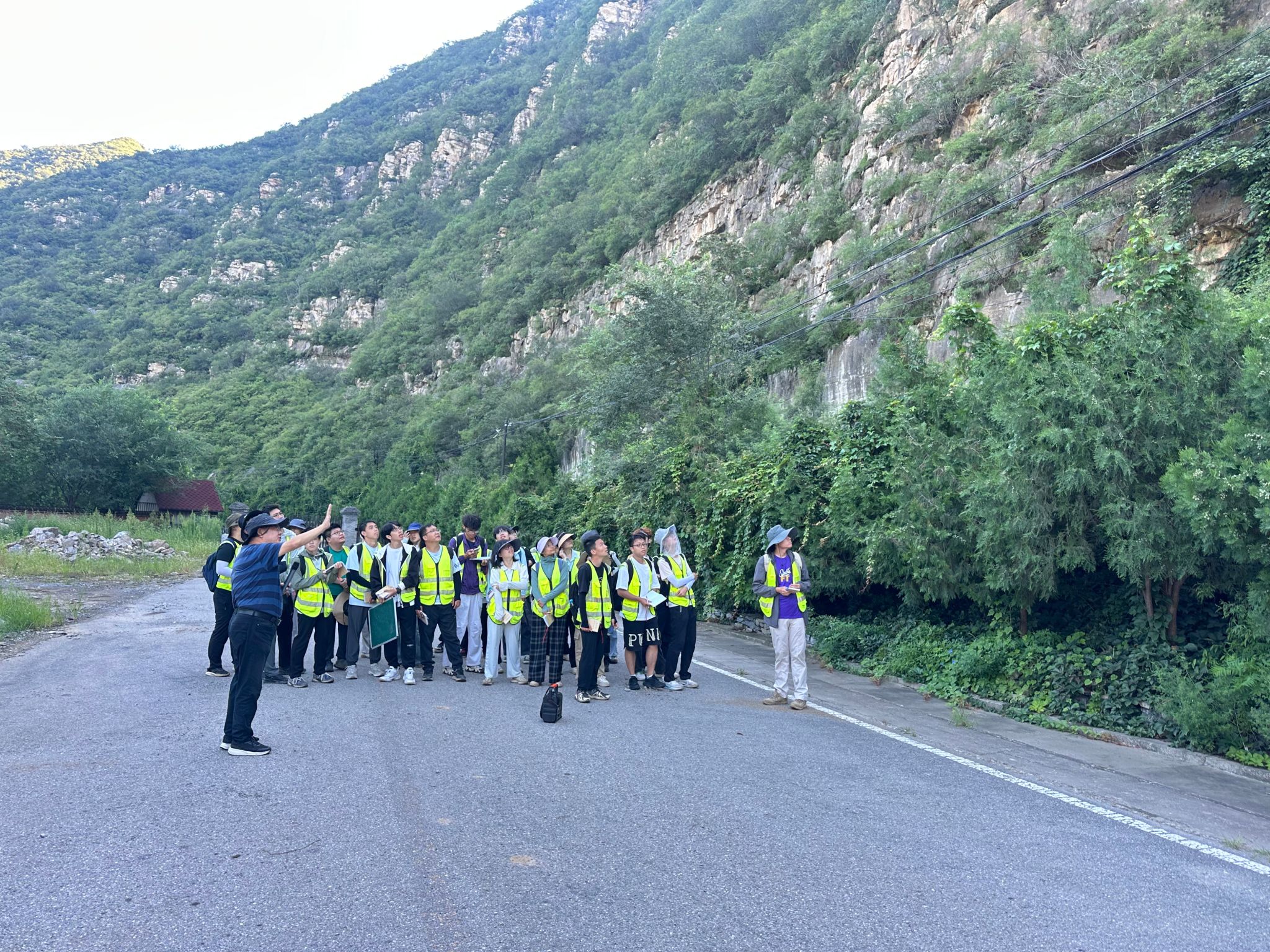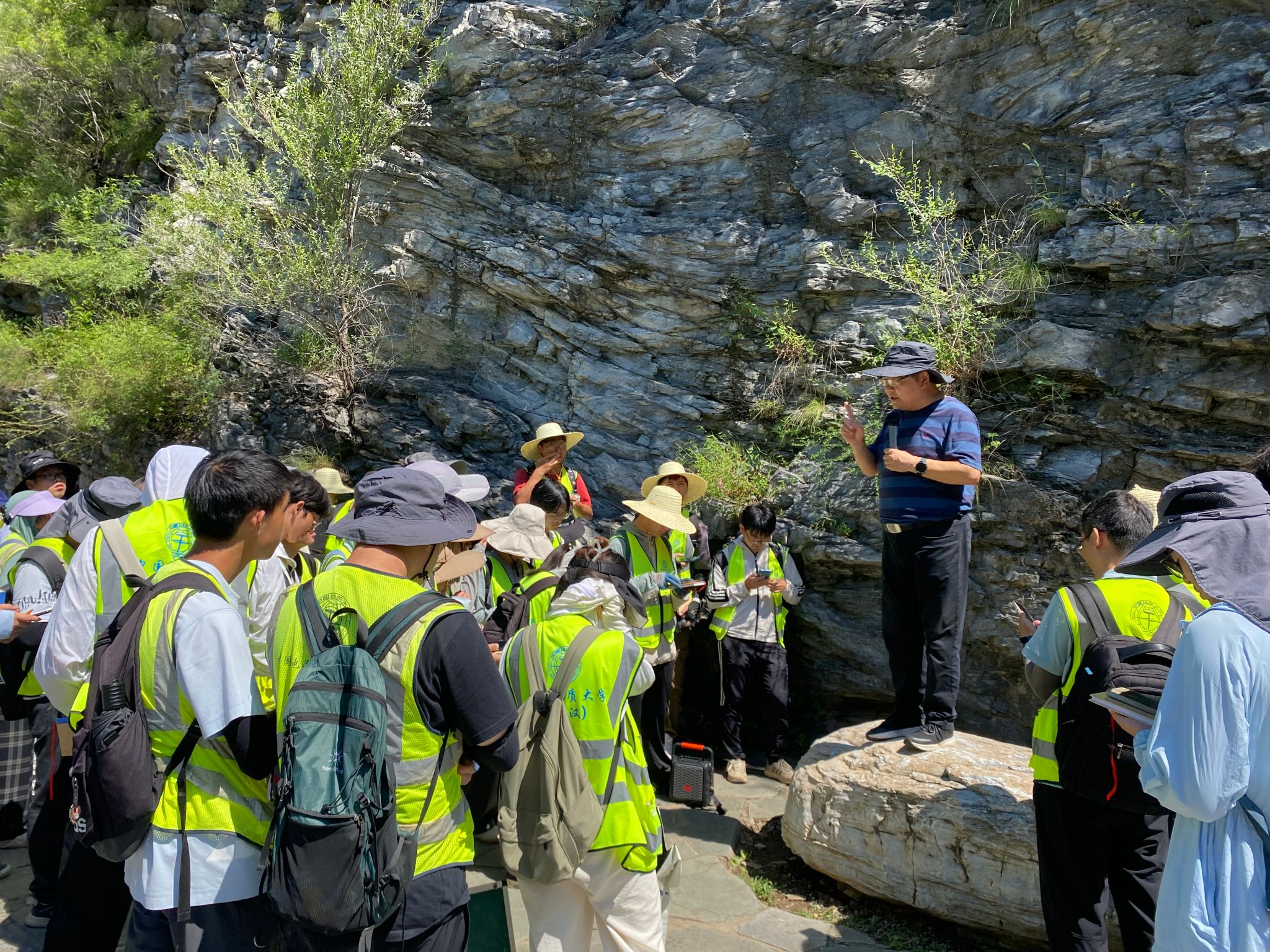 8月10日上午,王亮清一行与实习师生一同前往黄山店实习路线,全程参与野外实践教学。在陡峭的山路上,王亮清与师生共同观察地层构造、分析沉积环境,并结合典型地质现象现场讲解。王亮清强调,周口店实习是地质工程人才培养的关键环节,周口店这本天然教科书,需要以脚步丈量,更需要用创新思维解读。他对同学们提出三点期望:一是以实践锤炼本领,在野外观察中树立“将今论古”的演化思维;二是强化安全意识,通过复杂地质条件下的工程问题模拟训练,提升风险研判与处置能力;三是拥抱技术变革,积极运用AI地质罗盘等智能装备开展野外工作。他指出,作为我校历史最悠久的野外实践基地,周口店实习基地培养了大批优秀地质人才,被誉为“地质工作者的摇篮”,他勉励同学们传承“摇篮精神”,夯实专业基础,为服务国家地质事业积蓄力量。