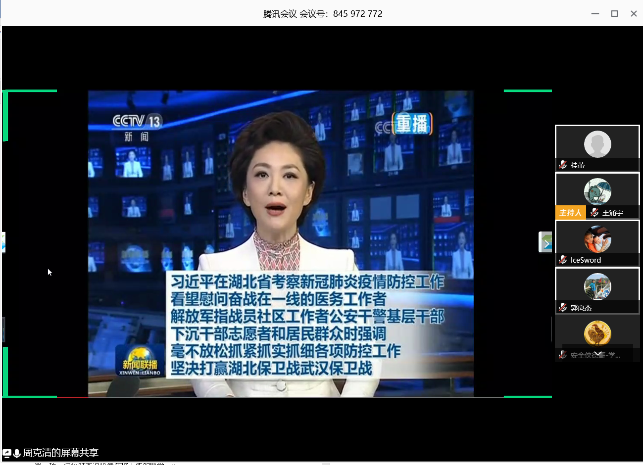 近期工作。庞奇志介绍了学校生活状态和学校志愿者的工作状况,志愿者的工作仍然十分辛苦,为学校教师的日常生活提供了巨大帮助;郭良杰和胡东涛分享目前武汉市交通状况,介绍了外地人员返回武汉的相关政策,给支部的老师们返校提出了宝贵意见,同时,肯定了部分外地返汉同事自觉隔离的行为;周克清书记介绍了系里近期工作安排,希望党员同志带头克服困难,积极配合做好系里招生宣传、博士后流动站评估、学院网站建设和教学等各项工作。