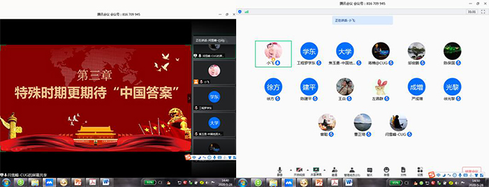 2020528日下午230分,地下空间工程系党支部通过“腾讯会议”软件在网络上进行了主题为《聚焦全国两会,凝聚决战决胜的中国信心》的支部党日活动,支部全体党员同志参会。地工系党支部书记谭飞同志主持了本次主题党日活动。全体与会党员唱国歌,并重温了入党誓词。随后,由闫雪峰同志带领大家开展了本次主题学习。