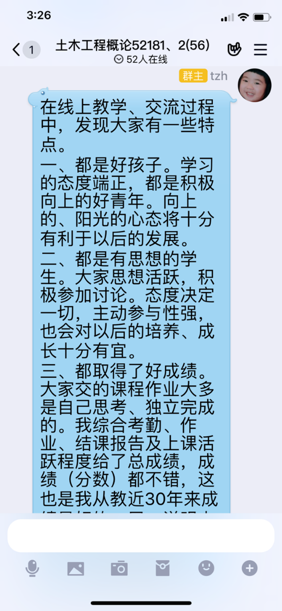 除了云课堂正常授课之外,为了拓宽同学们的视野,增加他们的学习和热情,我系老师还多次组织了校外著名专家学者的讲座授课。3月份,应永利集团官网副院长王亮清教授邀请,中建三局基础设施建设投资有限公司技术部经理、武汉雷神山医院(医护区)总工贾瑞华高工,在线为我校本科生上专业讲座课并作学术报告。正是有了老师和学生们的共同努力,我系这一学期“停课不停学”的所有课程都达到了圆满的效果。
