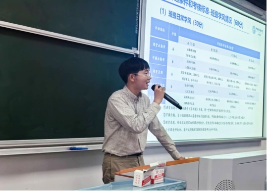2024级辅导员彭友元介绍《永利集团官网(武汉)永利集团官网“优良学风示范班”创建评选办法》。他从“优良学风示范班”总体要求、创建流程、考核指标、奖惩办法等四个方面进行介绍,重点解读了班级政治理论学习、遵纪守法与文明修养、集体观念、班级制度建设、班级干部表现等5项班级综合表现指标,课堂出勤、早操出勤、课堂表现、作业完成情况、自习组织情况等5项班级日常学风指标,平均学分绩点、优秀率、及格率和英语四级通过率等4项班级课程成绩指标,以及学生参加科技创新活动等附加分项目指标。他要求同学们仔细阅读创建办法文件,对照量化评估考核指标,积极开展富有班级特色的学风建设活动。